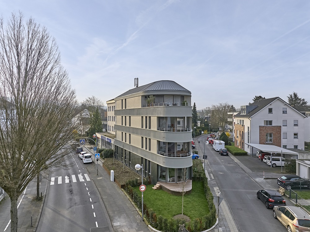 Dove un tempo si trovava il cortile di una cassa di risparmio, è stato realizzato un nuovo edificio residenziale che, insieme all'edificio esistente della banca riutilizzato, si integra armoniosamente nell'ambiente architettonico di Bad Honnef. La forma triangolare dell'immobile è stata ripresa con precisione, con una testa d'edificio incisiva e arrotondata che valorizza sia il panorama urbano che lo spazio stradale.