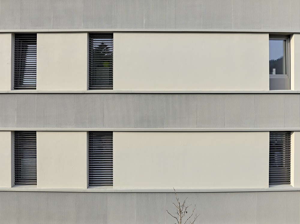 Fasce di intonaco con tecnica a pettine a base di intonaco leggero minerale G 3679, superfici intonacate e piastrelle: la fine decorazione della facciata e i colori perfettamente abbinati coniugano artigianalità e chiarezza architettonica. Il gioco di elementi verticali e orizzontali sottolinea la dinamica dell'edificio e riprende le linee dell'edificio esistente.
