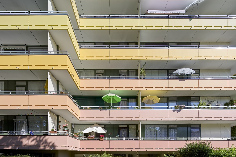 I lunghi edifici plurifamiliari di Bergisch Gladbach apparivano piuttosto monotoni prima del risanamento: la vecchia verniciatura color ocra conferiva loro un aspetto tecnico e fragile. Con la necessaria bonifica del calcestruzzo si è presentata l'opportunità di migliorare non solo la struttura, ma anche l'immagine. La soluzione: una potente sfumatura cromatica che aggiungesse leggerezza e calore.