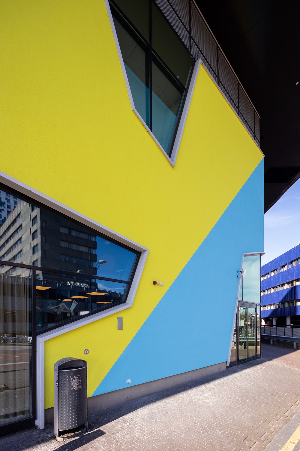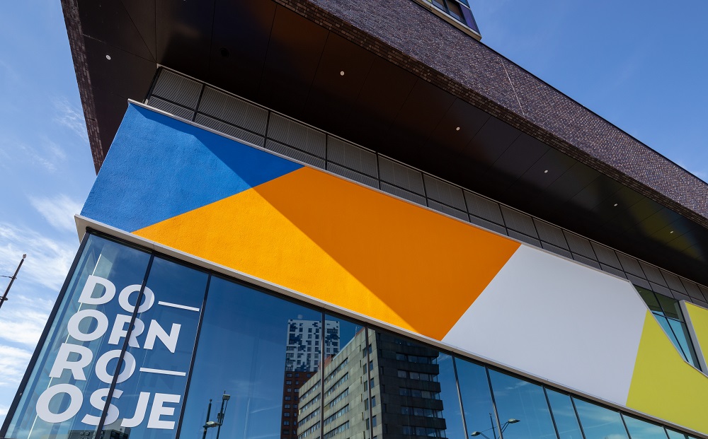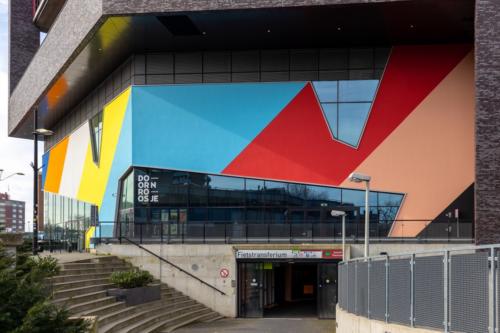 Il leggendario club dal vivo "Doornroosje" caratterizza la scena musicale di Nimega dal 1968. Nel 2014 si è trasferito nei tre piani interrati di un nuovo e moderno edificio presso la stazione. Tuttavia, il concetto del colore di facciata di un artista non era ancora stato completato. Solo nel 2023 è stato finalmente possibile ultimarlo: i piani inferiori del club risplendono di barre diagonali in dieci tonalità di colore ispirate alla comunità LGBTQ+ e conferiscono all'edificio la sua voce culturale verso l'esterno.